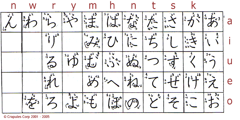 Les Hiragana sont des signes japonais et servent à transcrire les mots japonais. Cet alphabet compte 46 syllabes, ou 96 avec les variantes des 46 premières.Tableau des Hiragana