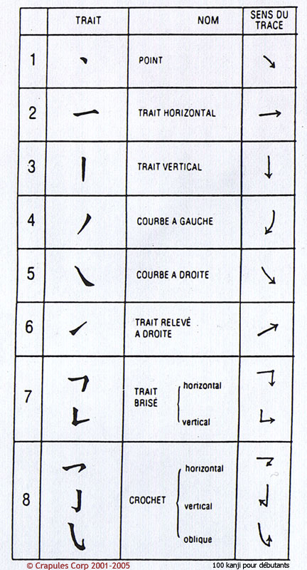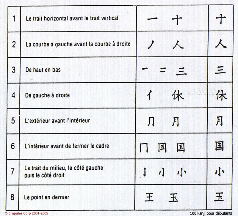 Pour finir, les kanjis répondent à huit règles d'écriture et comptent 8 tracés fondamentauxlorsqu'un trait horizontal se trouve en bas d'un caractère, il se trace en dernier.